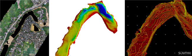 技術團隊采用了南方SU20無人船搭載測深儀測量水下地形、南方無人機掛載傾斜攝影相機測量兩岸地形,當晚就完成了水下外業(yè)勘測,并于7日上午完成了全部外業(yè)勘測。內業(yè)小組爭分奪秒處理測量數據,生產三維實景模型并繪制兩岸標準地形圖,7日中午輸出了初步成果。