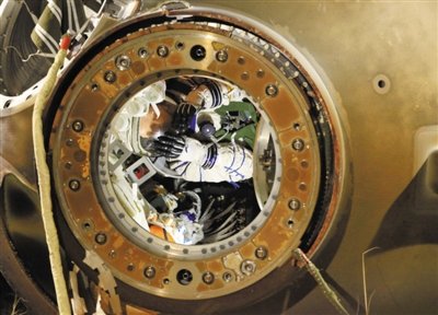 昨晚,神八飛船返回艙在內(nèi)蒙古四子王旗著陸。這是現(xiàn)場工作人員打開飛船艙門。