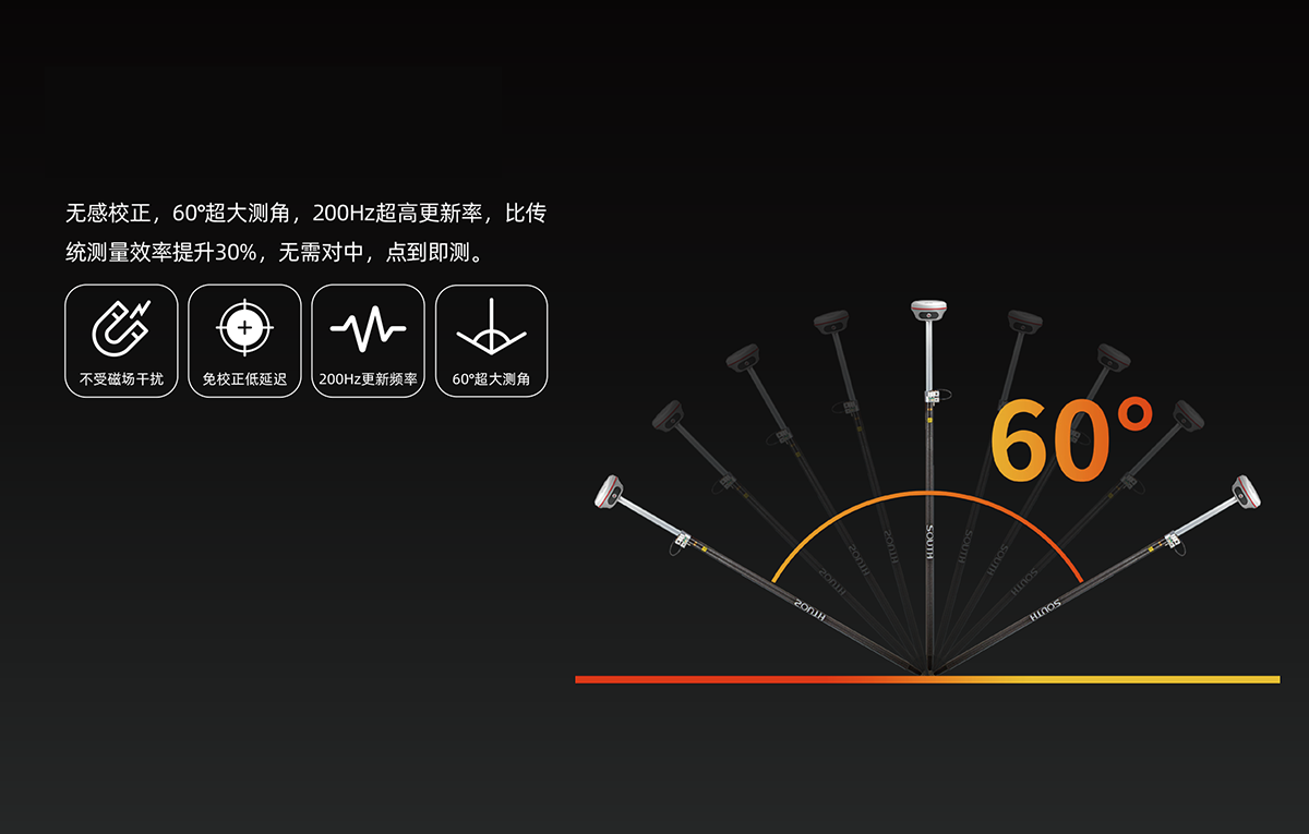 慣導(dǎo)傾斜測量 | 內(nèi)置IMU慣性測量傳感器,支持慣導(dǎo)傾斜測量功能,根據(jù)對中桿傾斜方向和角度自動校正坐標(biāo) |