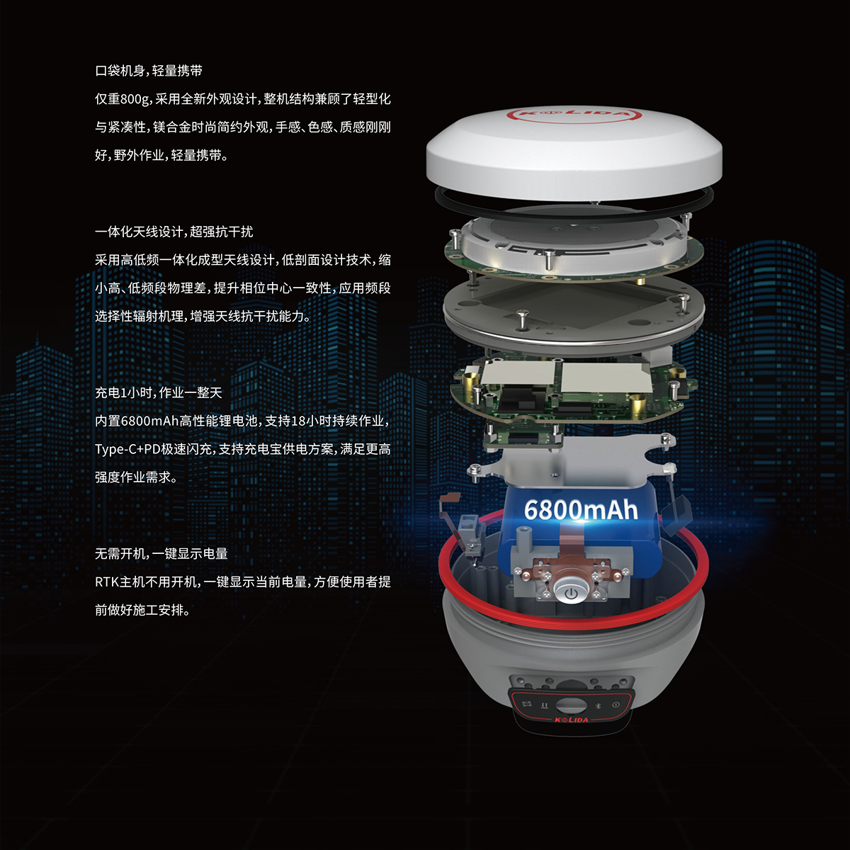 電池 | 內(nèi)置6800mAh高性能鋰電池 7.4V;移動(dòng)站手簿網(wǎng)絡(luò)模式作業(yè)滿足18小時(shí)續(xù)航時(shí)間 |