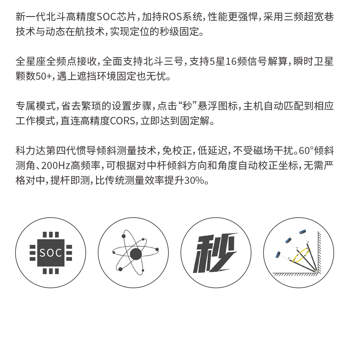 慣導(dǎo)傾斜測量 | 內(nèi)置IMU慣性測量傳感器,支持慣導(dǎo)傾斜測量功能,根據(jù)對(duì)中桿傾斜方向和角度自動(dòng)校正坐標(biāo)。 |