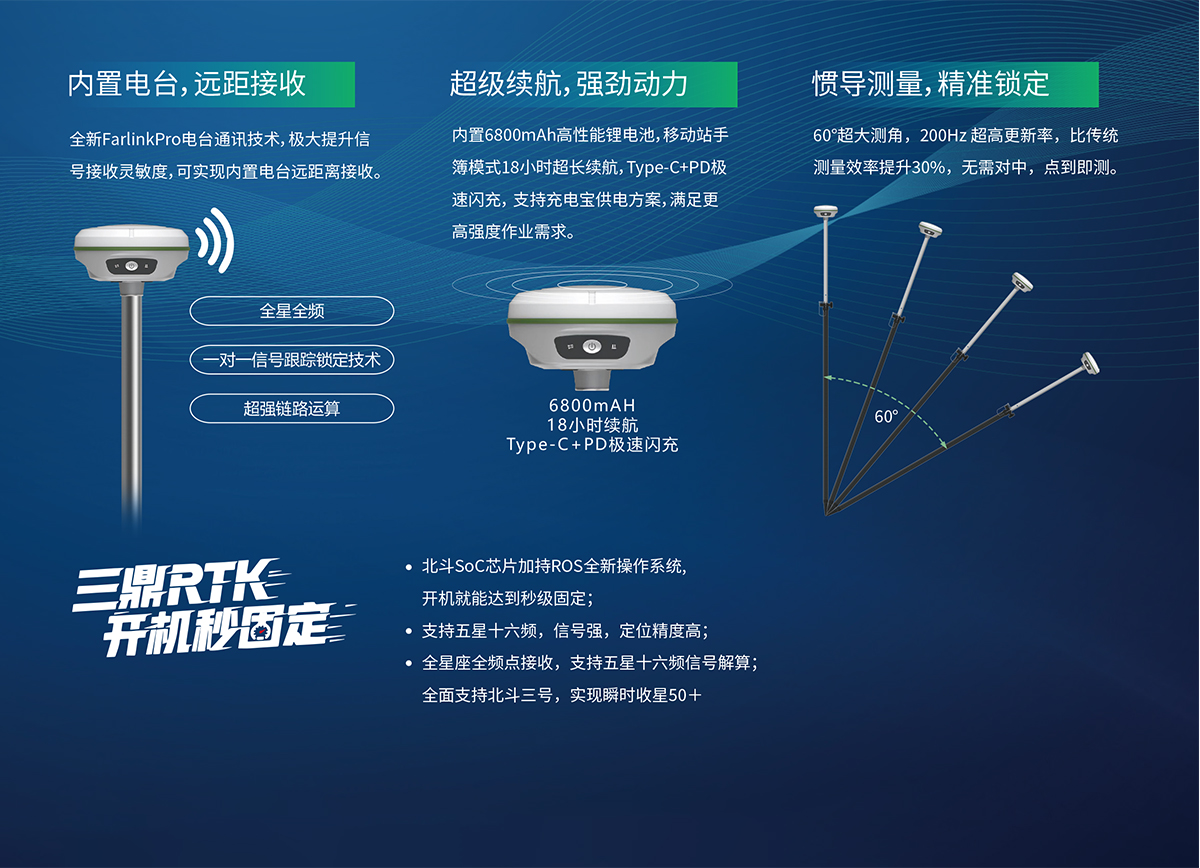 慣導(dǎo)傾斜測量 | 內(nèi)置IMU慣性測量傳感器,支持慣導(dǎo)傾斜測量功能,根據(jù)對中桿傾斜方向和角度自動校正坐標(biāo)。 |