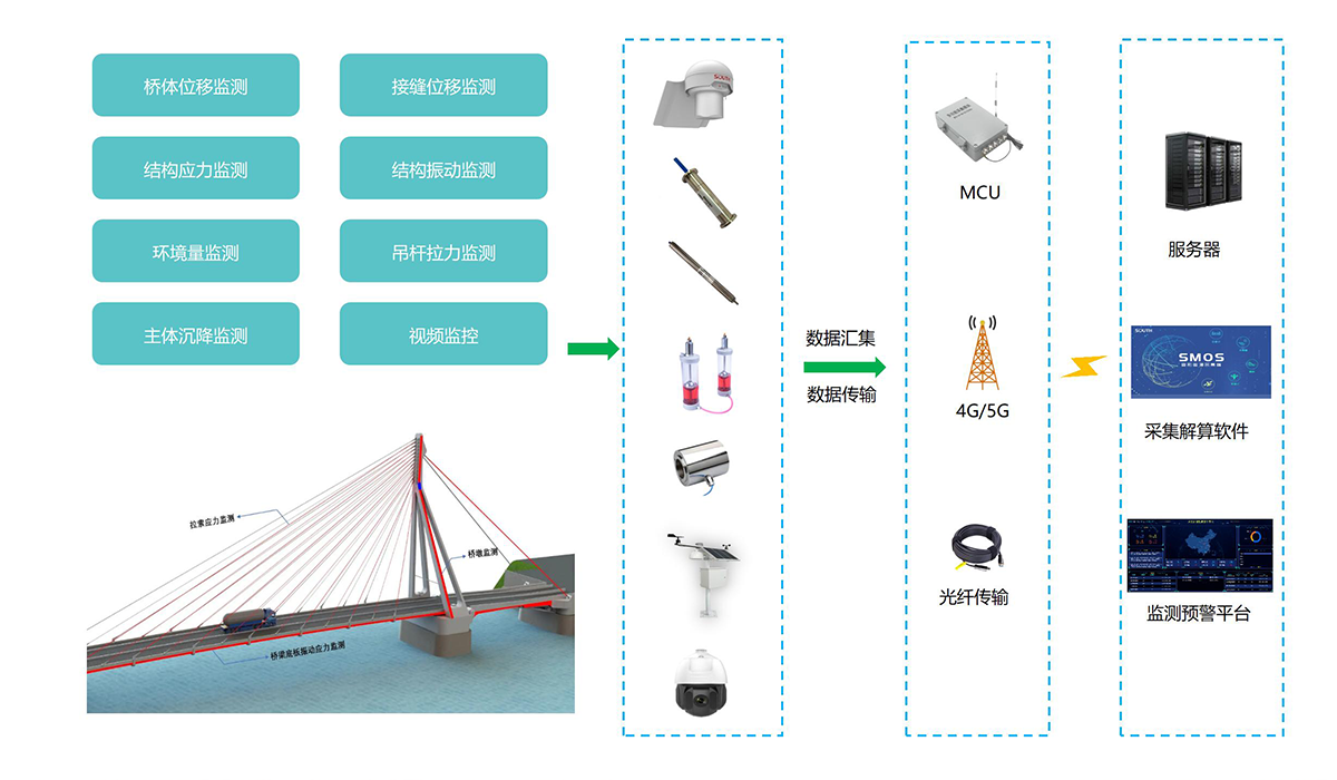 橋梁是城市交通的重要組成部分,承載著人們的出行需求和經(jīng)濟(jì)發(fā)展的壓力,隨著時(shí)間的推移和環(huán)境的變化,橋梁結(jié)構(gòu)的安全性和穩(wěn)定性面臨著日益嚴(yán)峻的挑戰(zhàn),為了及時(shí)發(fā)現(xiàn)橋梁結(jié)構(gòu)存在的問(wèn)題并采取有效的預(yù)防措施,亟需對(duì)橋梁結(jié)構(gòu)健康開(kāi)展實(shí)時(shí)監(jiān)測(cè),動(dòng)態(tài)掌握橋梁結(jié)構(gòu)運(yùn)行狀況,進(jìn)一步提升公路橋梁結(jié)構(gòu)監(jiān)測(cè)和安全保障能力。